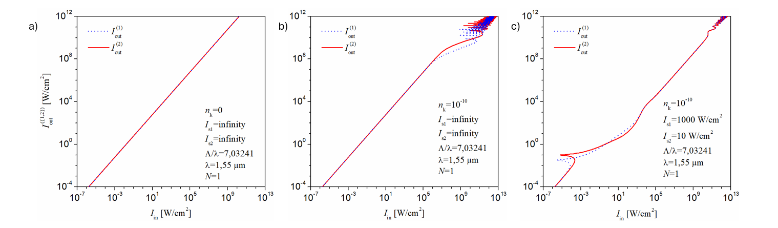 Analizę przeprowadzono z wykorzystaniem zmodyfikowanej metody macierzy transferu pozwalającej na opis przejścia fal przez kolejne warstwy struktury PT [1,2]. Otrzymano charakterystyki natężenia wyjściowego Iout({1,2}) w funkcji natężenia fali wejściowej Iin oraz parametrów badanej struktury PT. Na rysunku zaprezentowano trzy wybrane charakterystyki Iout({1,2}) dla następujących struktur: a) bez efektów nieliniowych; b) z uwzględnieniem wyłącznie efektu Kerra; c) z uwzględnieniem efektu Kerra i nasyceń wzmocnienia i strat. Pokazano silny wpływ efektu Kerra na przebieg charakterystyk wyjściowych w strukturze PT (rys.1b). W obecności nasyceń, efekt ten jest słabszy (rys.1c).