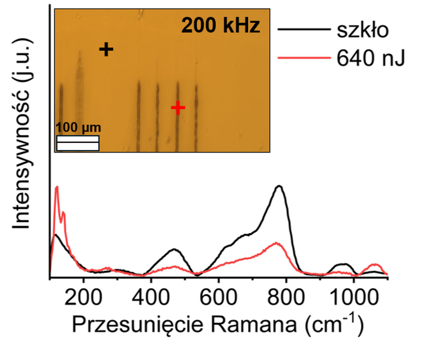 W niniejszej pracy przedstawiono wyniki badań strukturalnych (widma Ramana, SEM-EDS) oraz spektroskopowych (luminescencja) szkła tellurowo‒fosforanowego domieszkowanego jonami erbu po procesie DLW (laser: λ=1030 nm, 230 fs). Przy częstotliwości repetycji lasera fs równej 200 kHz i 330 kHz oraz energii impulsu w zakresie 400–800 nJ, uzyskano szklano-ceramiczne ścieżki zawierające cząstki metalicznego telluru (Te0) w układzie trygonalnym (Rys. 1). Na podstawie widm Ramana (Rys. 1) oraz analizy zdjęć SEM/EDS wykazano, że proces DLW prowadzi do zmiany ilości jednostek fosforanowych w strukturze szkła, tj. zmniejszenia liczby jednostek PO43- i wzrostu jednostek PO32-, które stabilizują metaliczny tellur. Obecność Te0 przyczyniła się do zwiększenia natężenia emisji jonów erbu dla długości fali ok. 525 nm w porównaniu do szkła niemodyfikowanego, co zostało zaprezentowane na widmach luminescencji