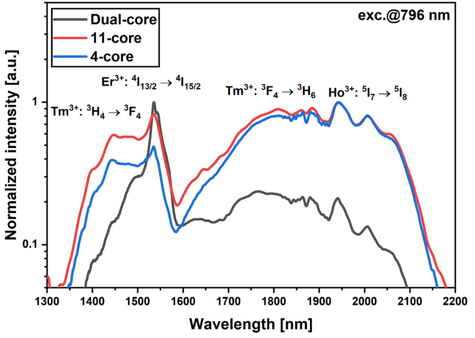 W referacie przedstawione zostaną właściwości luminescencyjne w zakresie 1,4-2,1 µm szkieł barowo-galowo-germanowych oraz wytworzonych z nich światłowodów wielordzeniowych Yb³⁺/Er³⁺/Tm³⁺/Ho³⁺. Zaprezentowane zostaną konstrukcje dwupłaszczowych światłowodów z jednym, dwoma, czterema oraz jedenastoma rdzeniami oraz przeanalizowane zostaną ich właściwości luminescencyjne. Ponadto, zaprezentowane zostaną szkła oraz szkło-ceramiki domieszkowane jonami Ni²⁺, Cr³⁺ lub Bi³⁺ (rdzenie światłowodów) pozwalające na rozszerzenie pasma luminescencji oraz konstrukcje światłowodów wielordzeniowych współdomieszkowanych.