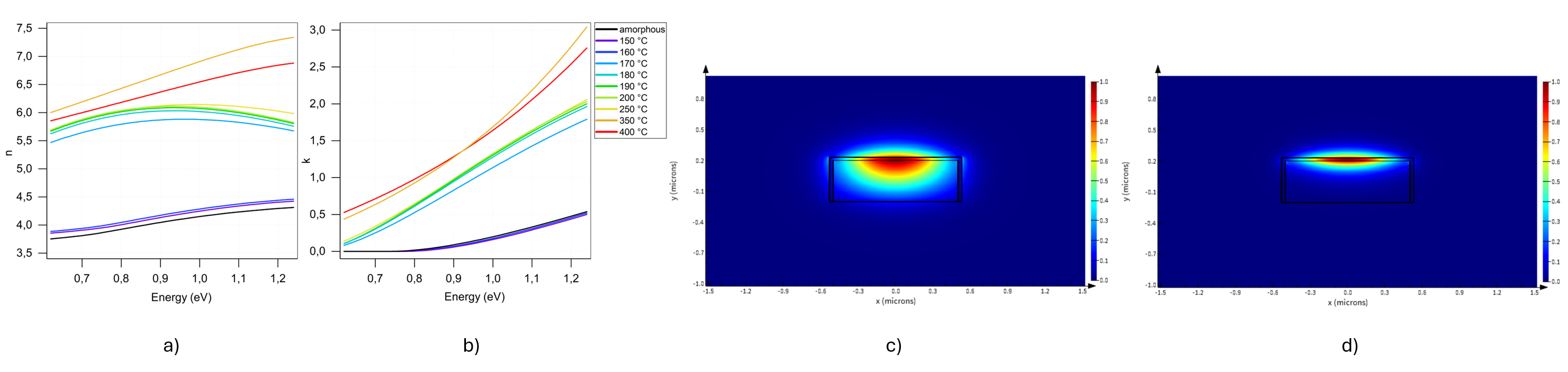 GST thin films were deposited on silicon substrates by magnetron sputtering. Amorphous samples were annealed in rapid thermal processing (RTP) system at different temperatures. In order to investigate optical properties of specimens, ellipsometric measurements were performed. In Fig. 1 n (a) and k (b) characteristics of samples annealed in different temperatures are plotted and manifest great changes during the phase changing process. The curves can be distinguished in three areas, corresponding to three different GST phases (amorphous, fcc, hcp). A tendency was observed for the optical constants values to increase with increasing annealing temperature. Simulations of field distribution and propagated modes were conducted in the Lumerical FDE solver for a 400 nm x 1 µm SiN waveguide. The waveguide, surrounded by a GST layer and encompassed by SiO2, was modeled in 2D for 1550 nm using obtained ellipsometry data. Electric field distribution of the fundamental TE mode (mode 0) for a SiN waveguide with a 32,5 nm layer of amorphous GST and crystallized GST at 170°C is presented in Figure 1. Images show visible differences in guided mode, affecting transmission through such a structure depending on GST layer state.