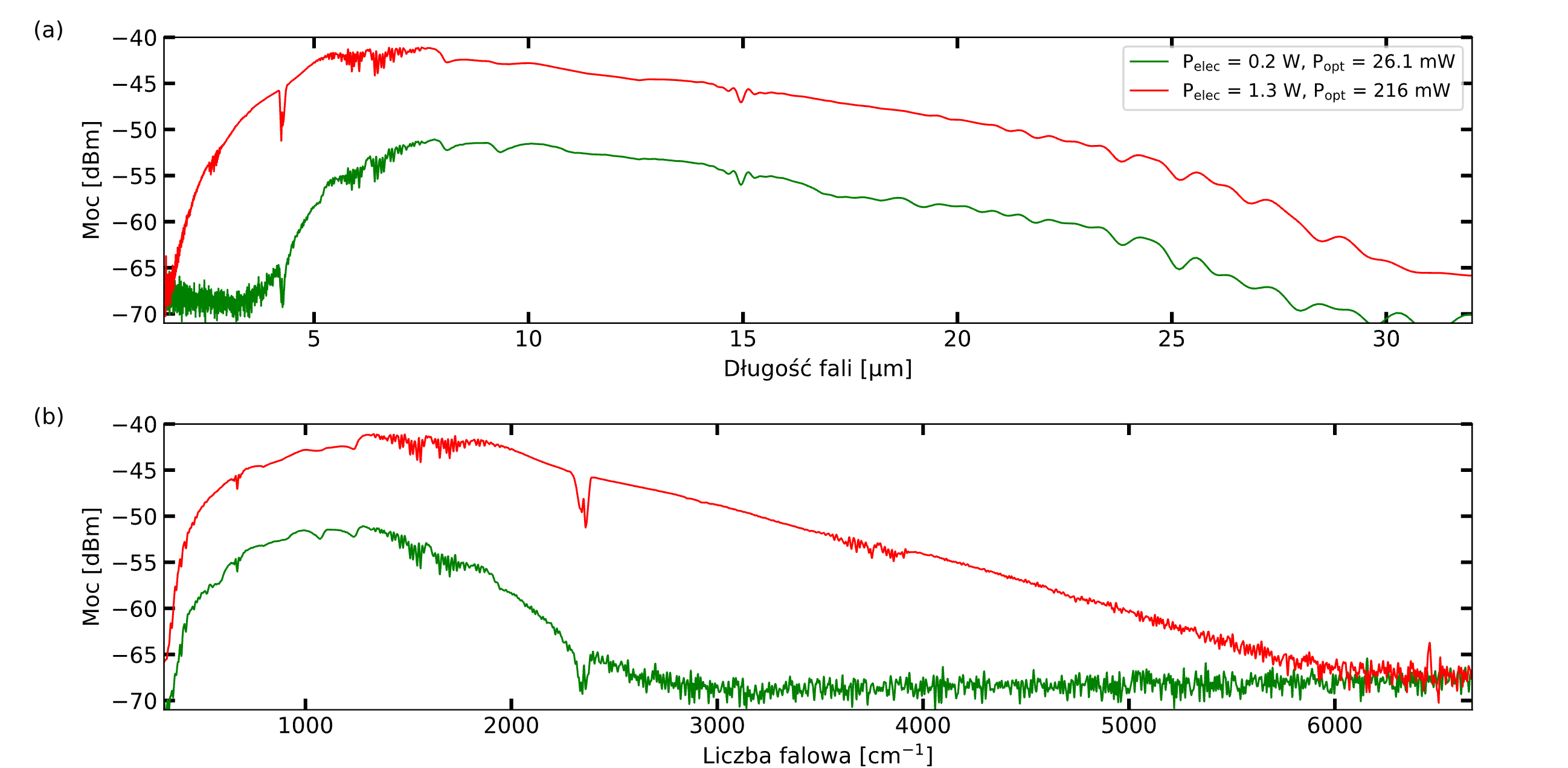 Prezentujemy przyrząd do FTIR pokrywający obszar widma od 1,6 do 31 µm (9.7 – 190 THz) (Rys. 1) w statycznej konfiguracji toru optycznego, w temperaturze pokojowej, z poborem mocy na poziomie pojedynczych watów i rozdzielczością lepszą niż 1.5 cm-1 (45 GHz). Osiągnięcie tych parametrów jest możliwe dzięki zastosowaniu cienko-membranowych, szerokopasmowych detektorów piroelektrycznych z tantalanu litu, niskotemperaturowego źródła termicznego z pokryciem z mikroproszku ceramicznego o wysokiej emisyjności dla fal o długości >10 µm oraz metody korekty niedoskonałości pozycjonowania lustra ruchomego wykorzystującej laser telekomunikacyjny i transformację Hilberta. Porównujemy zastosowane materiały i metody do popularnych odpowiedników, omawiamy ich ograniczenia oraz prezentujemy wyniki praktycznej spektroskopii gazowych postaci H2O i CO2 ze szczegółami absorpcyjnymi zarejestrowanymi od 5 do 25,5 µm. Omawiane rozwiązania szczególnie dobrze nadają się do miniaturyzacji aparatury do FTIR.
