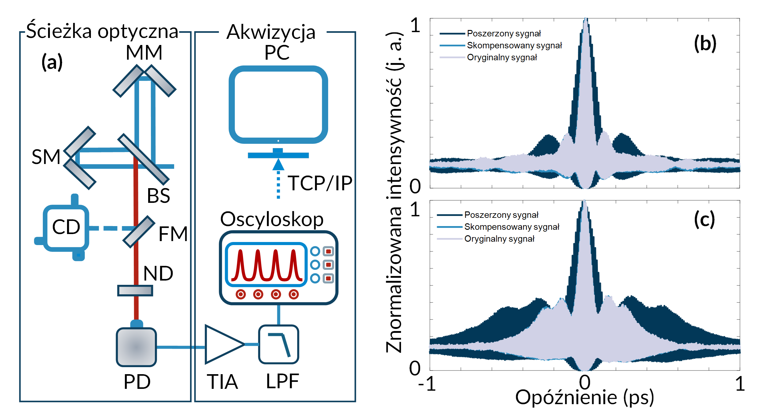 Przeprowadzono systematyczne badania efektu mikrownęki [1], w którym wielokrotne przejścia światła między zwierciadłami rezonatora FP wzmacniają sygnał TPA, jednocześnie poszerzając profil impulsu z powodu dyspersji wewnątrzwnękowej i długiego czasu życia fotonu w rezonatorze (Rys. 1b). Porównując szerokości impulsów zmierzonych klasycznie oraz z detektorem TPA, określiliśmy funkcję rozmywania. Dzięki dekonwolucji sygnału autokorelacji, poszerzenie jest kompensowane w szerokim zakresie mocy średnich i szczytowych. Najniższa zmierzona średnia moc wyniosła 22 µW, w porównaniu z 8 mW przy użyciu komercyjnego autokorelatora. Innymi słowy, wykorzystując efekt mikrownęki uzyskano zwiększenie czułości o ok. 360 razy.
