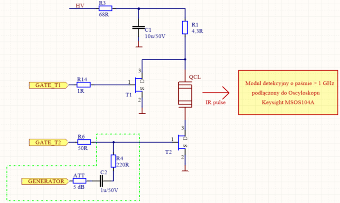 W ramach przeprowadzonych badań opracowano sterownik lasera umożliwiający generację impulsów laserowych o czasie trwania od 20 ns do 1 µs, współpracujący z laserem QCL, generującym promieniowanie o długości fali 4,7 µm. Badanie zaprojektowano w celu oceny możliwości zastosowania modulacji amplitudowej nałożonej na impuls laserowy oraz określenia maksymalnej częstotliwości pracy. Modulację analogową impulsu zrealizowano sprzęgając sygnał sinusoidalny z generatora funkcyjnego z wejściem bramki tranzystora HEMT sterującego prądem zasilania lasera. Schemat układu zaprezentowano na Rys. 1.